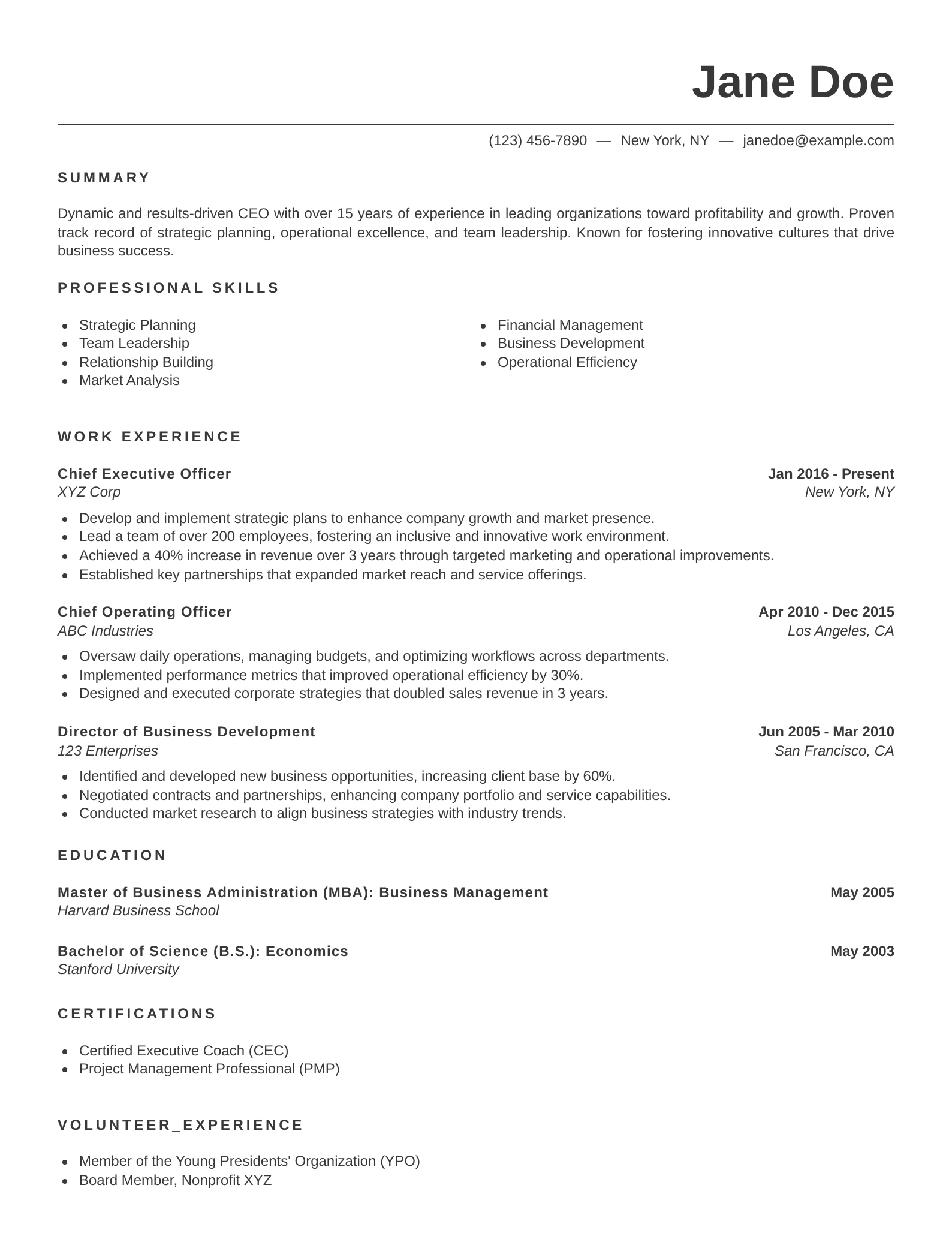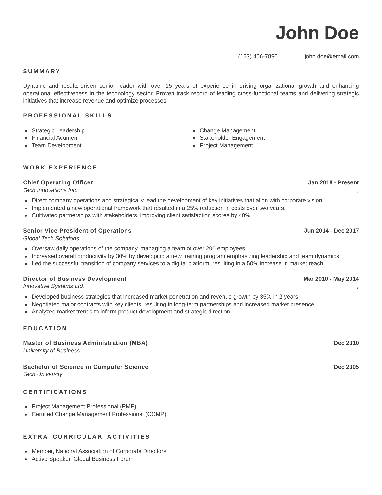 A senior executive resume for a CEO should emphasize strategic direction, business development, and the ability to create strategic plans that drive business growth. Highlight career highlights such as market trends analysis, forming strategic partnerships, and leading cross-functional teams to increase operational efficiency. Example: