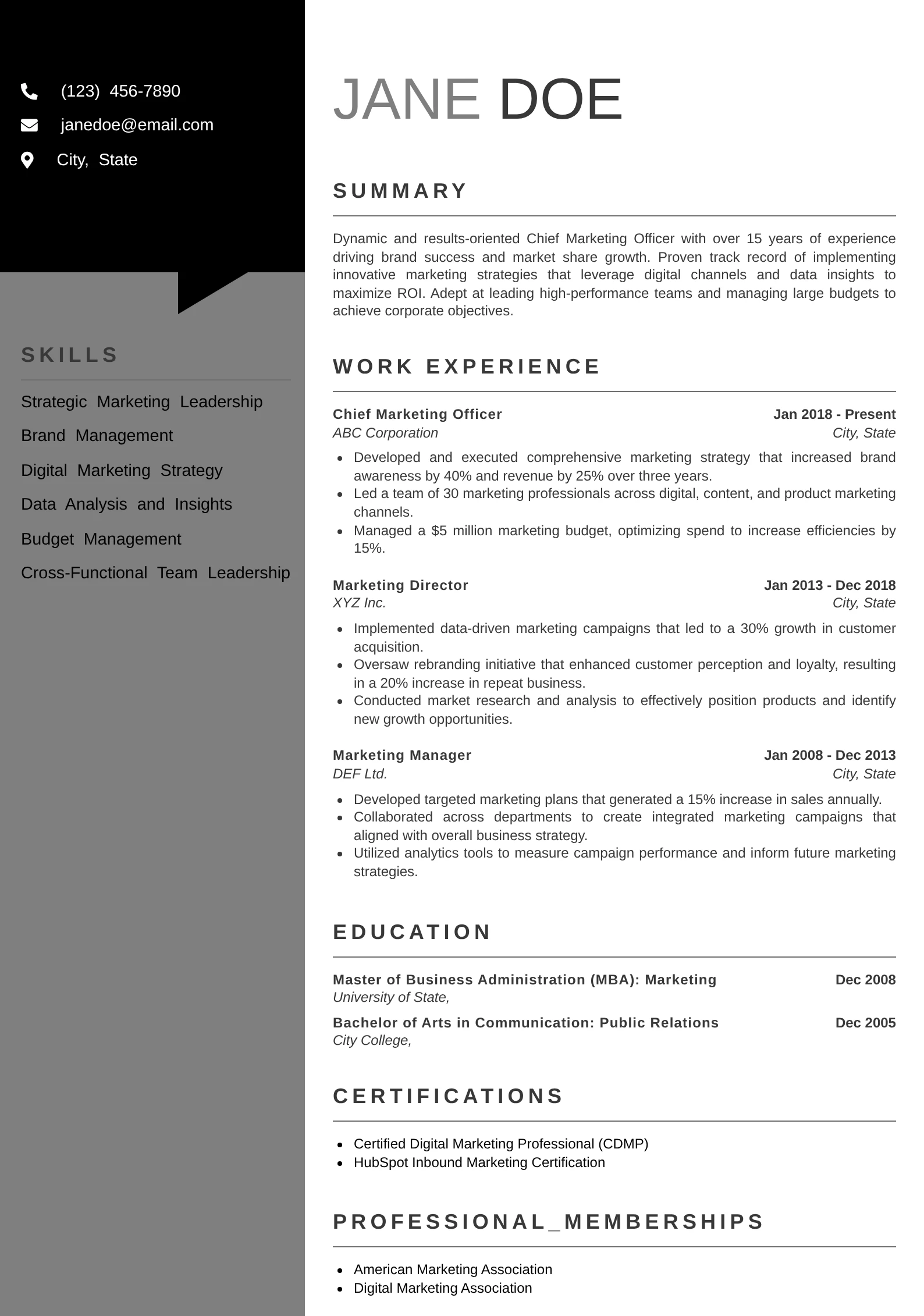 A chief marketing officer’s resume should demonstrate industry expertise and the ability to lead a marketing team that delivers measurable outcomes. Focus on strategic leadership, market trends, and examples of building a powerful personal brand for the company, along with concrete examples of successful campaigns. Example: