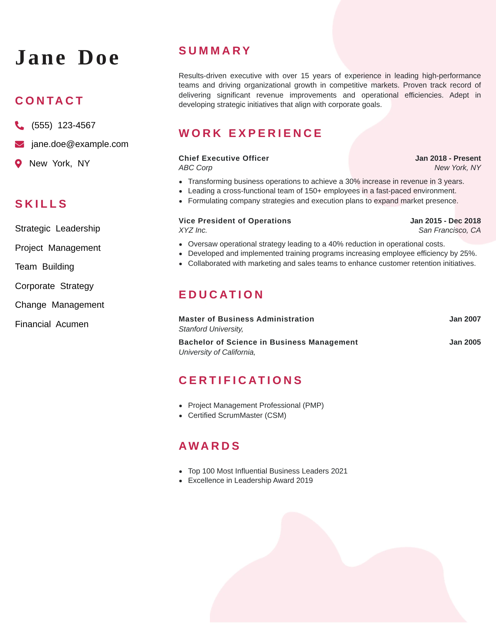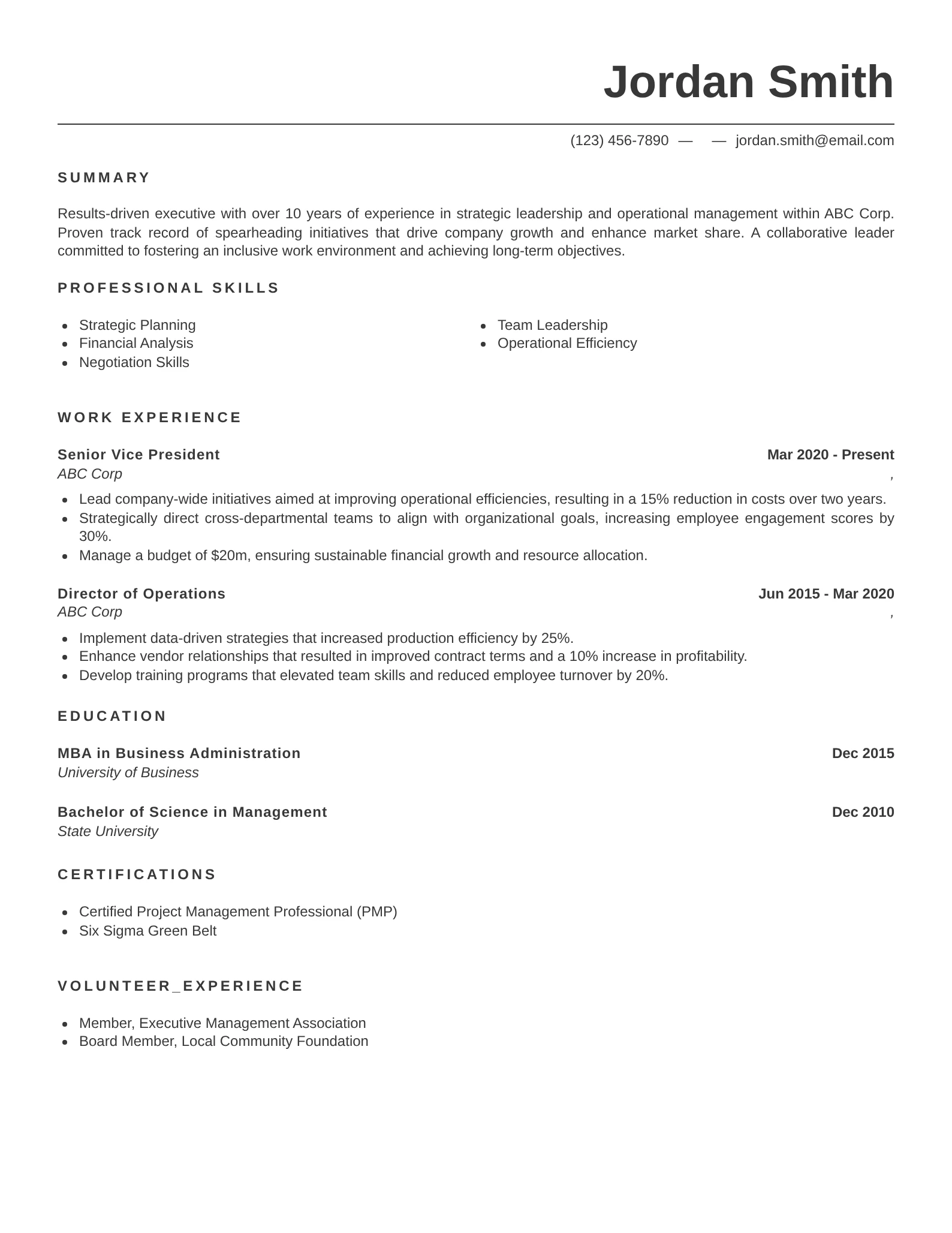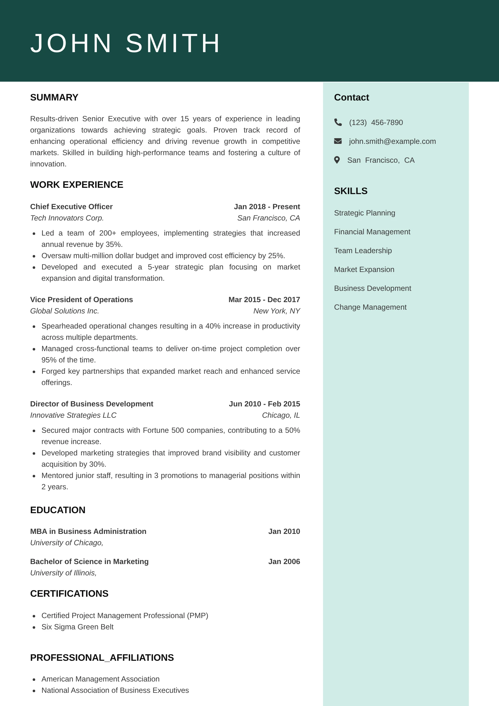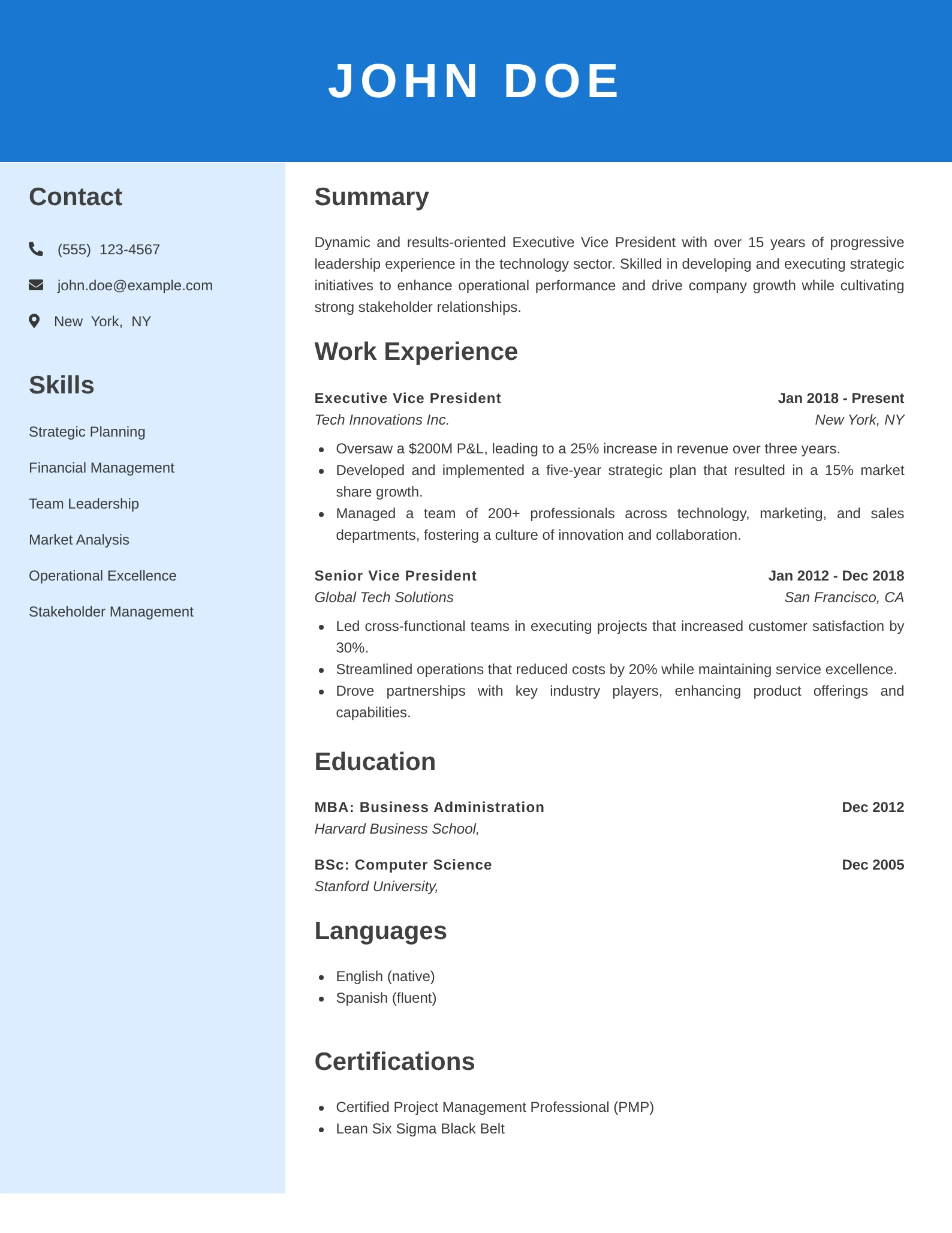 Choosing the right template is about more than design—it’s about ensuring the structure amplifies your story. Whether you advanced in the same company, expanded global reach, or led transformative business unit initiatives, these executive resume examples offer flexible and professional layouts to align with your career achievements. Ultimately, strong resumes of top executives highlight a blend of measurable outcomes, strategic insight, and a powerful personal brand, ensuring candidates stand out in today’s competitive market.