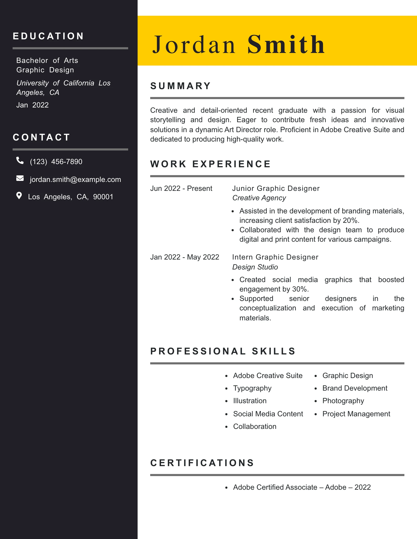 The summary clearly articulates Jordan’s recent graduate status and enthusiasm for an Art Director role, effectively setting the stage for the rest of the resume.
