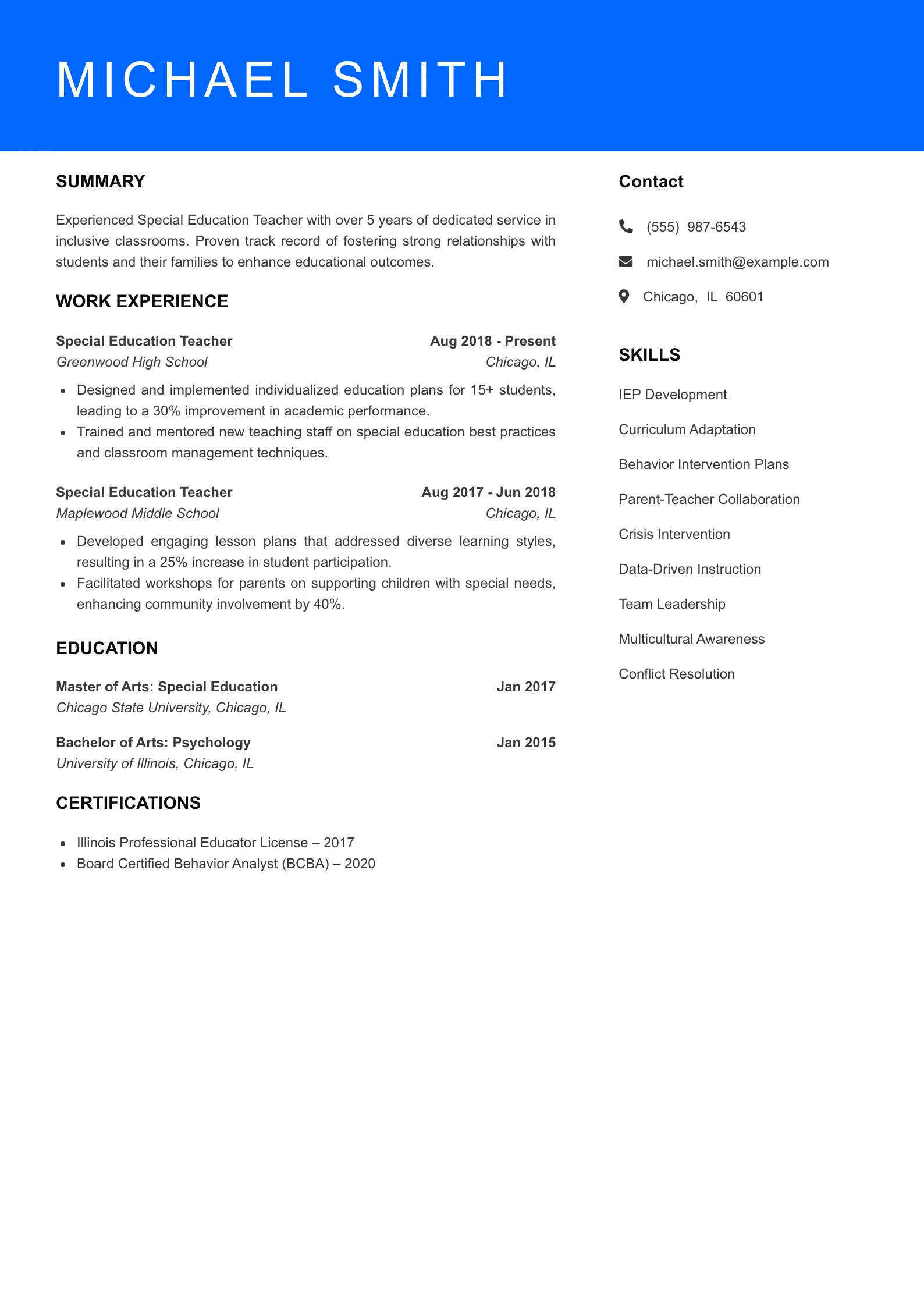 - The summary clearly outlines Michael’s experience and commitment, providing a strong foundation for his qualifications as a Special Education Teacher, which helps set the tone for the rest of the resume.