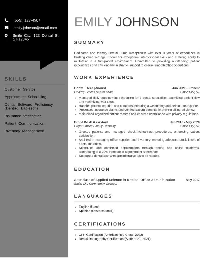 Below is a sample resume template that you can customize to fit your dental receptionist job application.