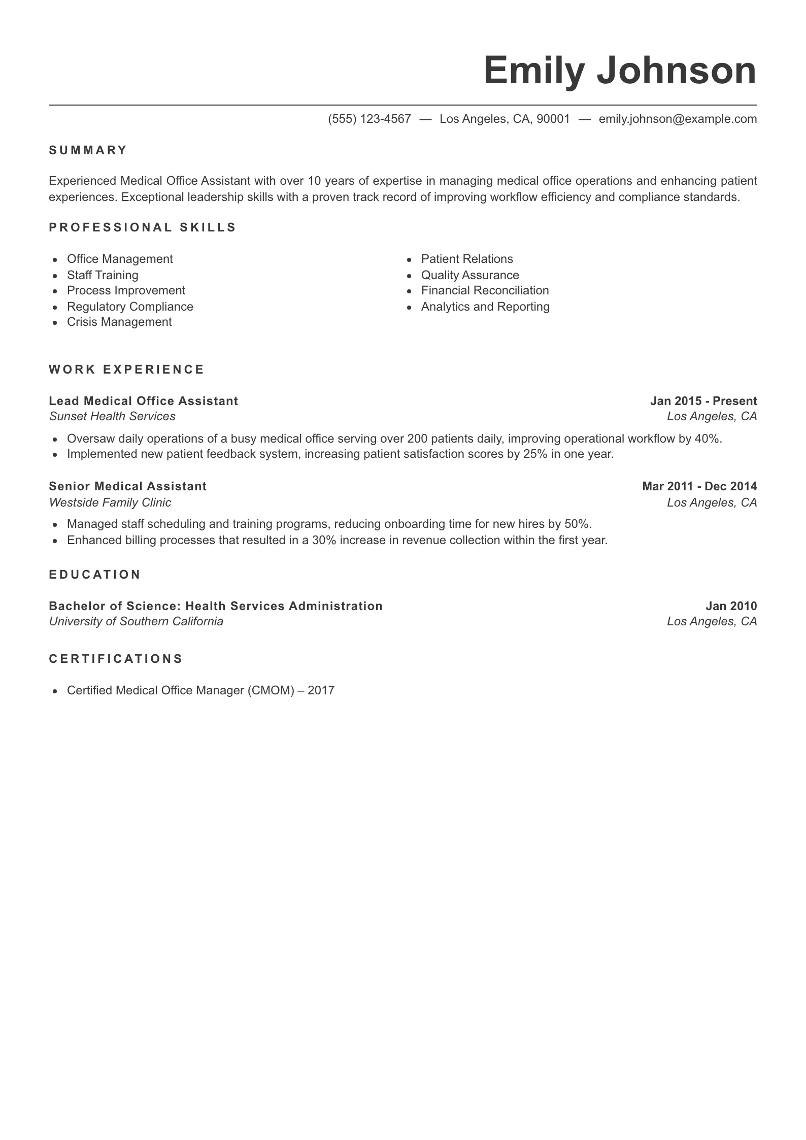 - The summary effectively communicates Emily’s extensive experience and leadership skills, clearly positioning her as a seasoned professional in medical office management.