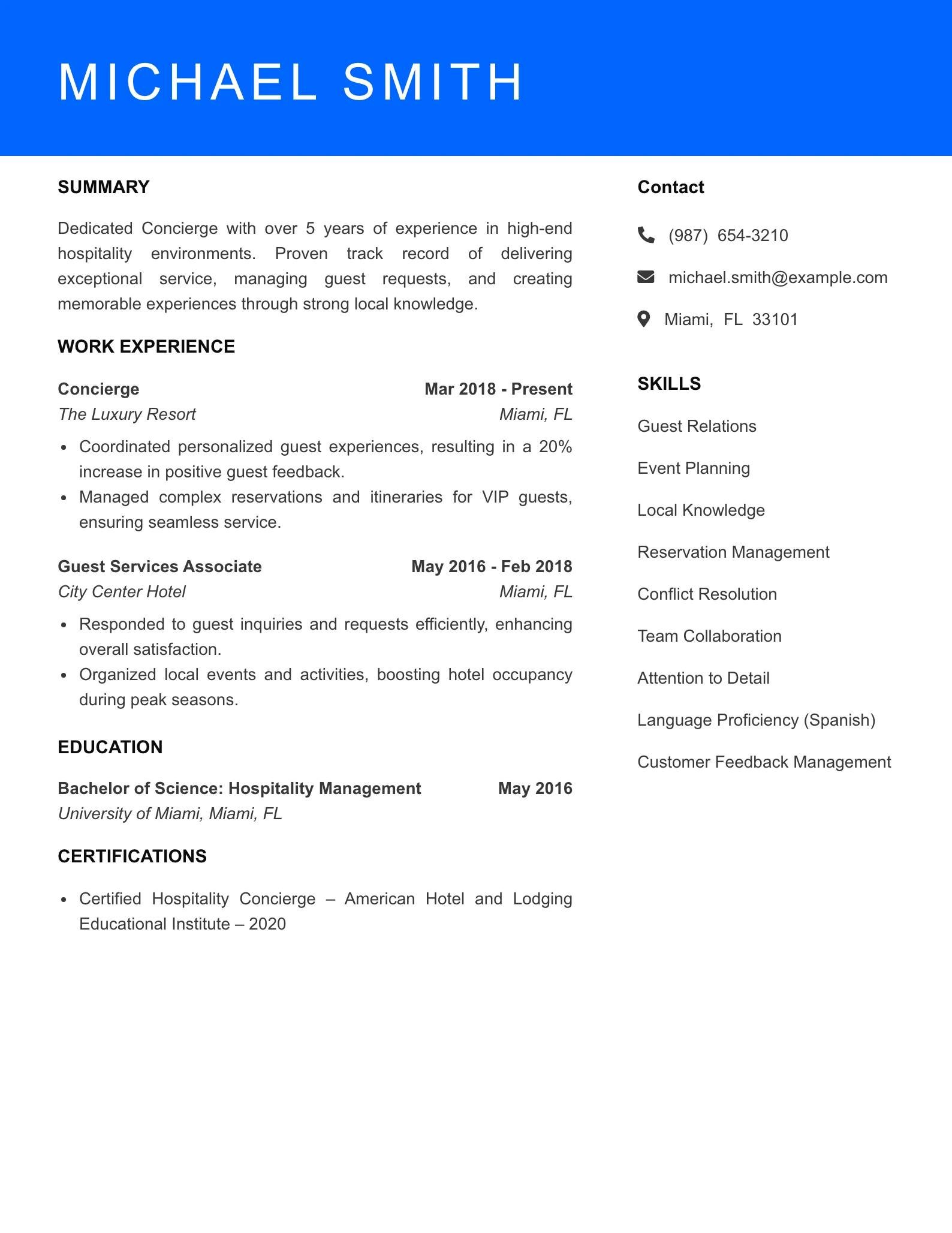 In the bustling hospitality industry, a standout Concierge resume is essential to capture the attention of potential employers. Whether you’re a seasoned professional or just starting your career, our collection of resume examples for Concierge will guide you in showcasing your unique skills and experiences. Check out our curated examples to craft a Concierge resume that truly reflects your strengths—and stay tuned till the end for free text-based resume samples for related jobs that you can simply copy and paste.