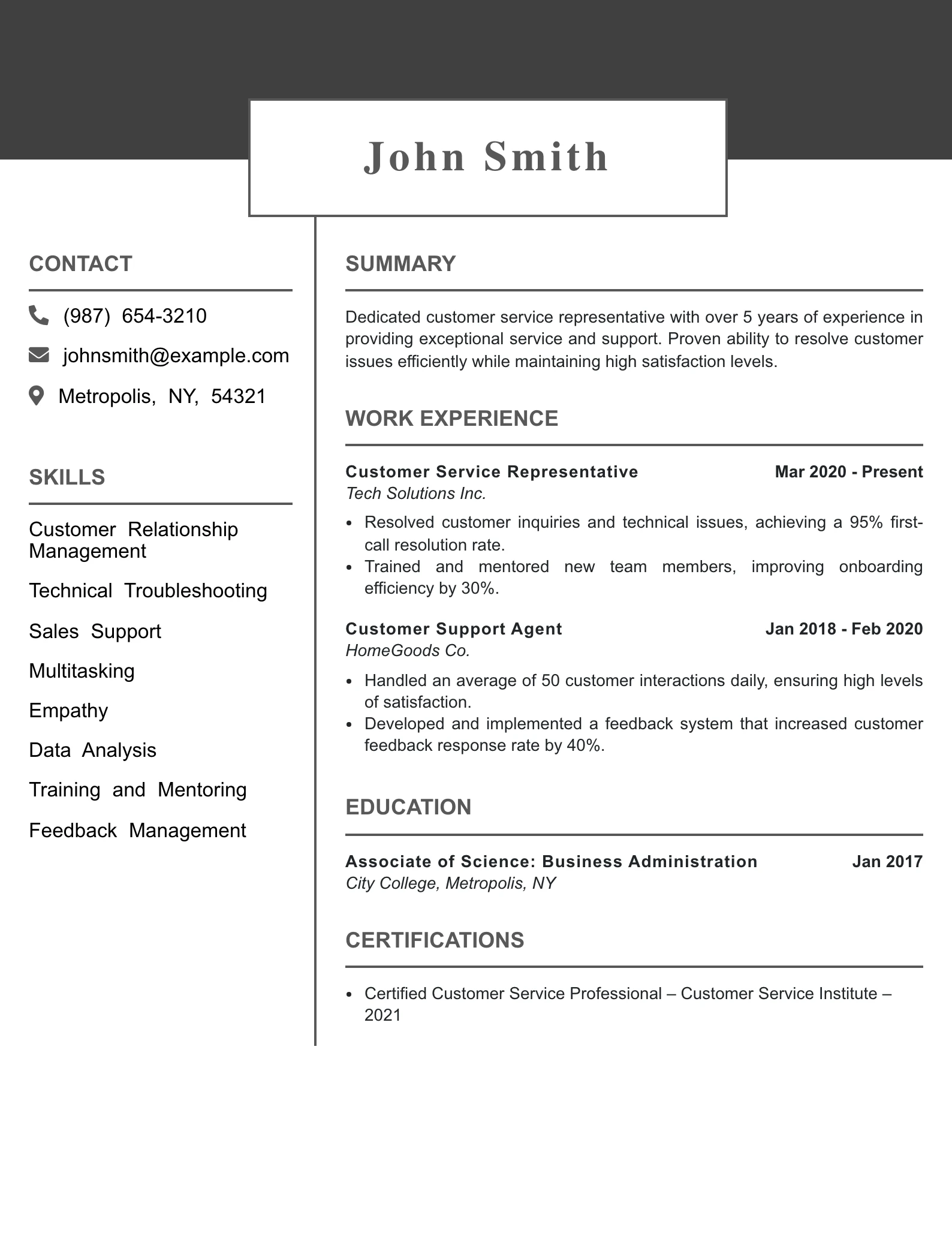 Looking to land your next job in customer service? A strong customer service resume can help you stand out in today’s competitive job market. On this page, you’ll find expert-written customer service resume examples you can download for free, customize, and use as inspiration to build your own. Whether you’re just starting out or have years of experience, these resume samples are tailored to highlight your communication skills, problem-solving ability, and customer satisfaction expertise.