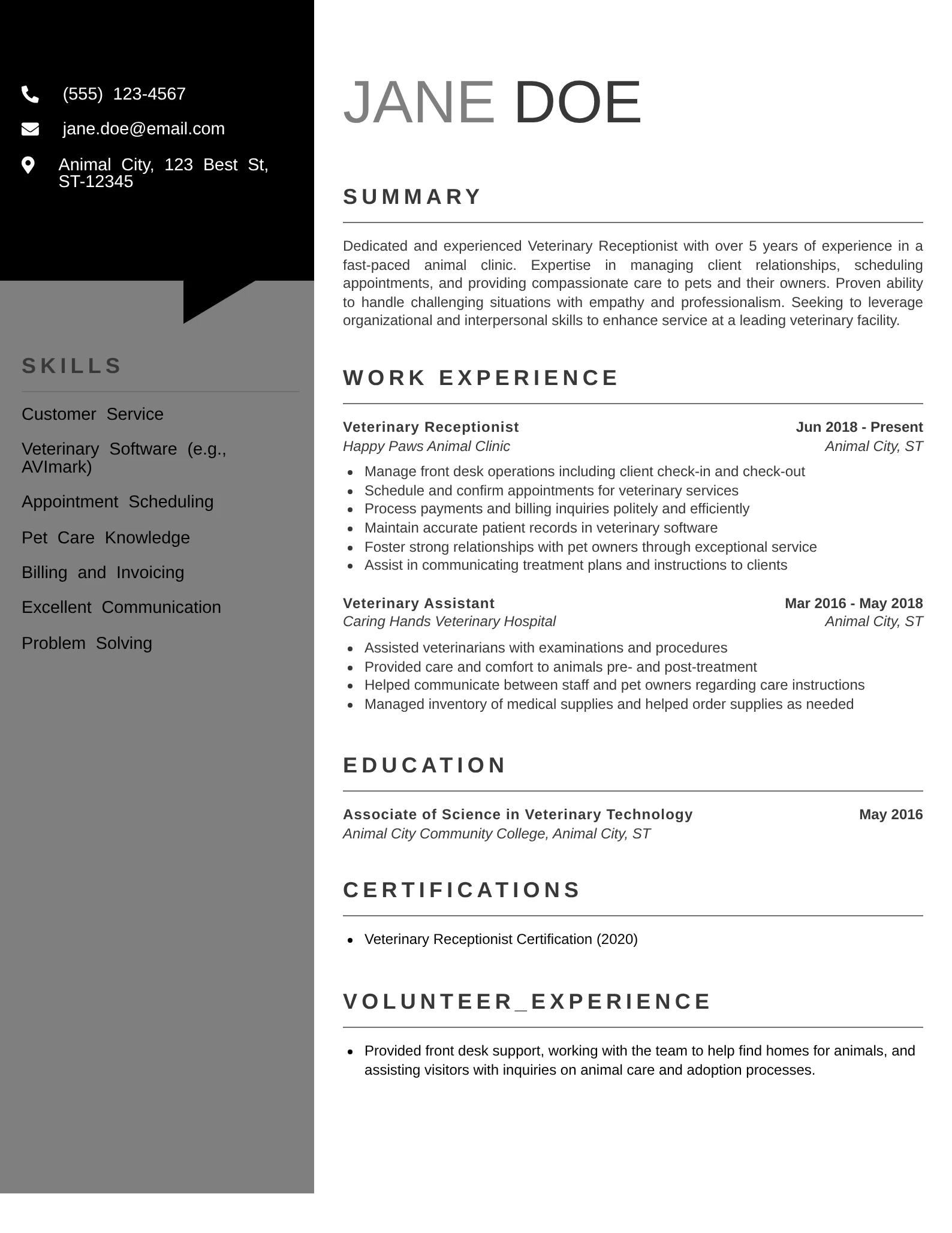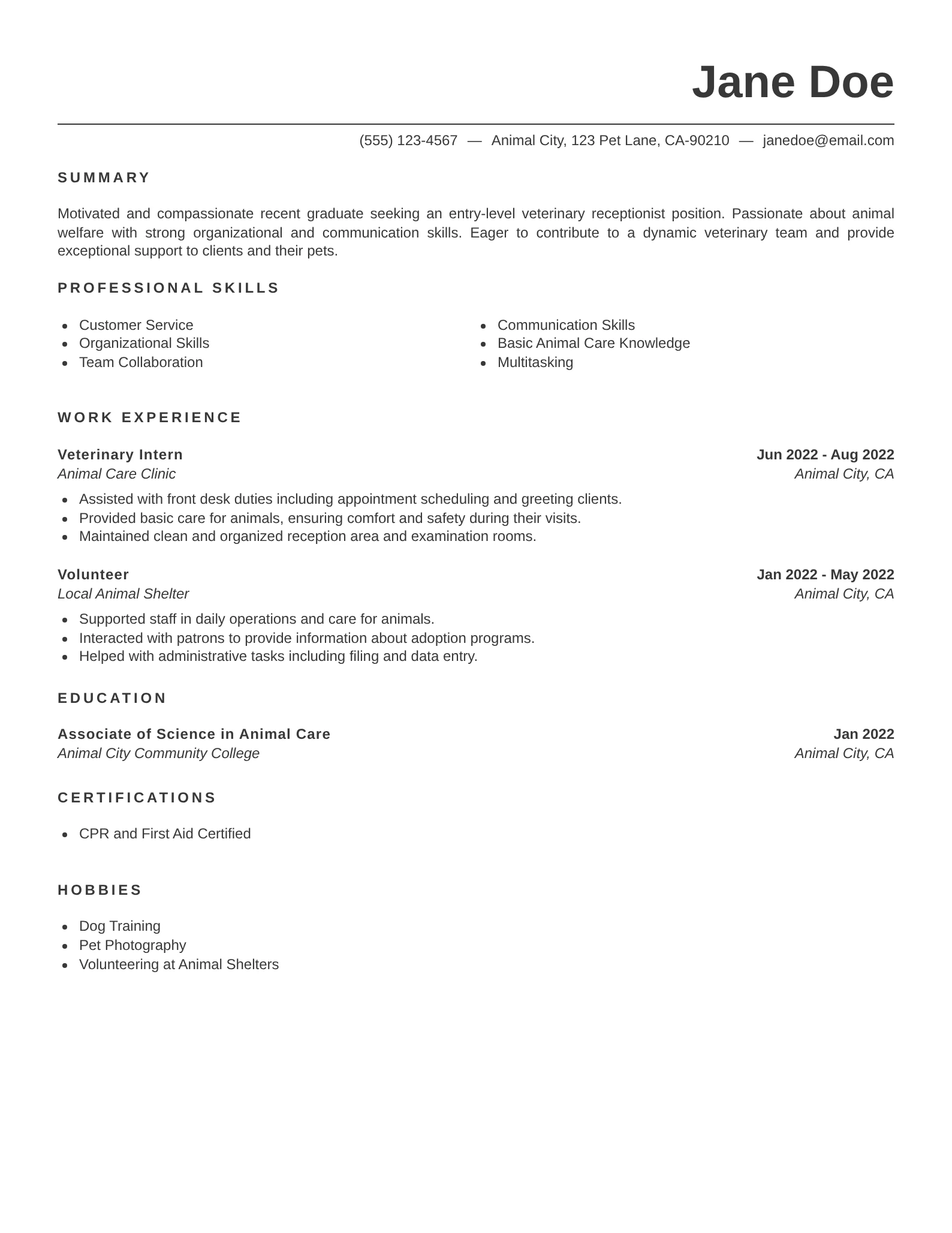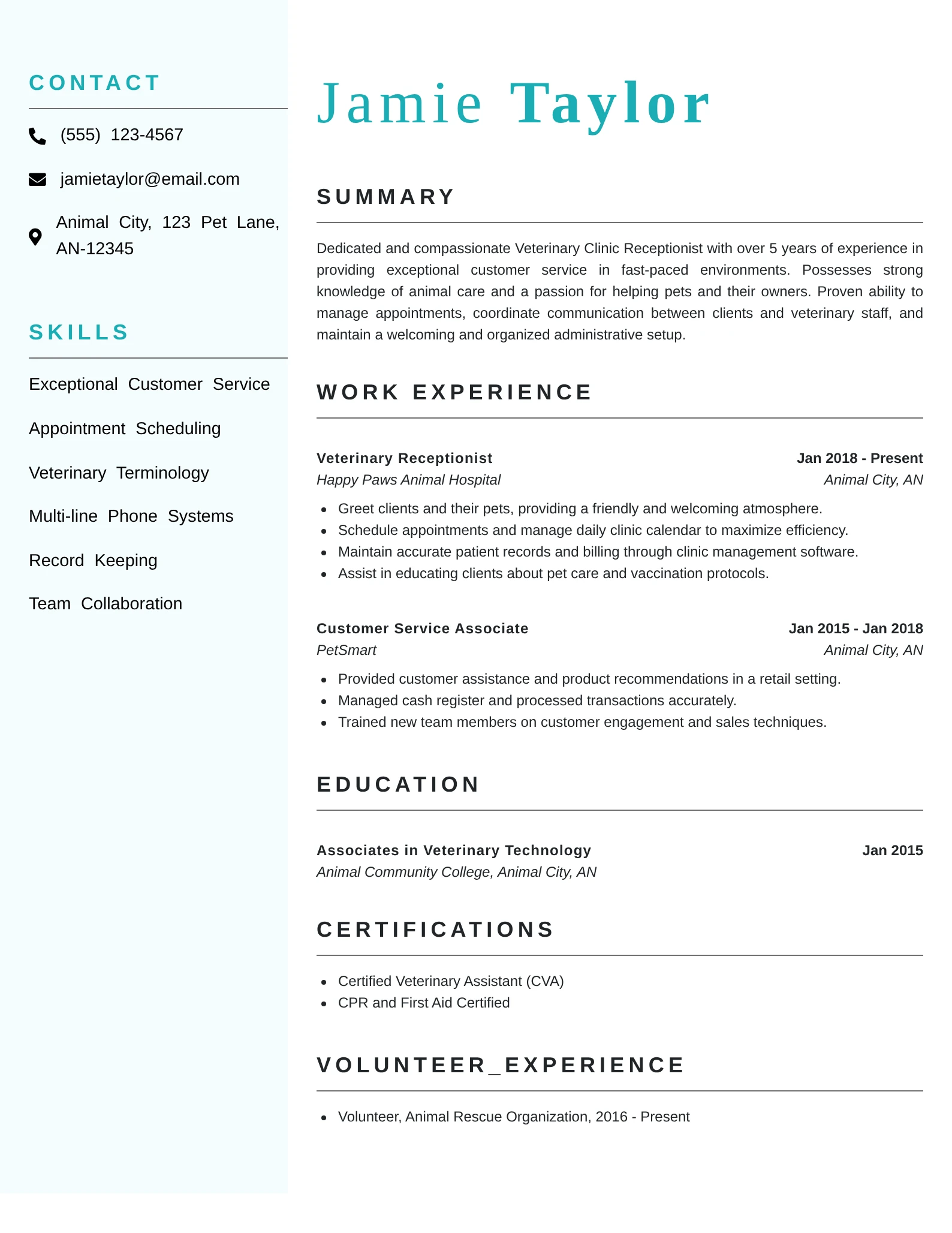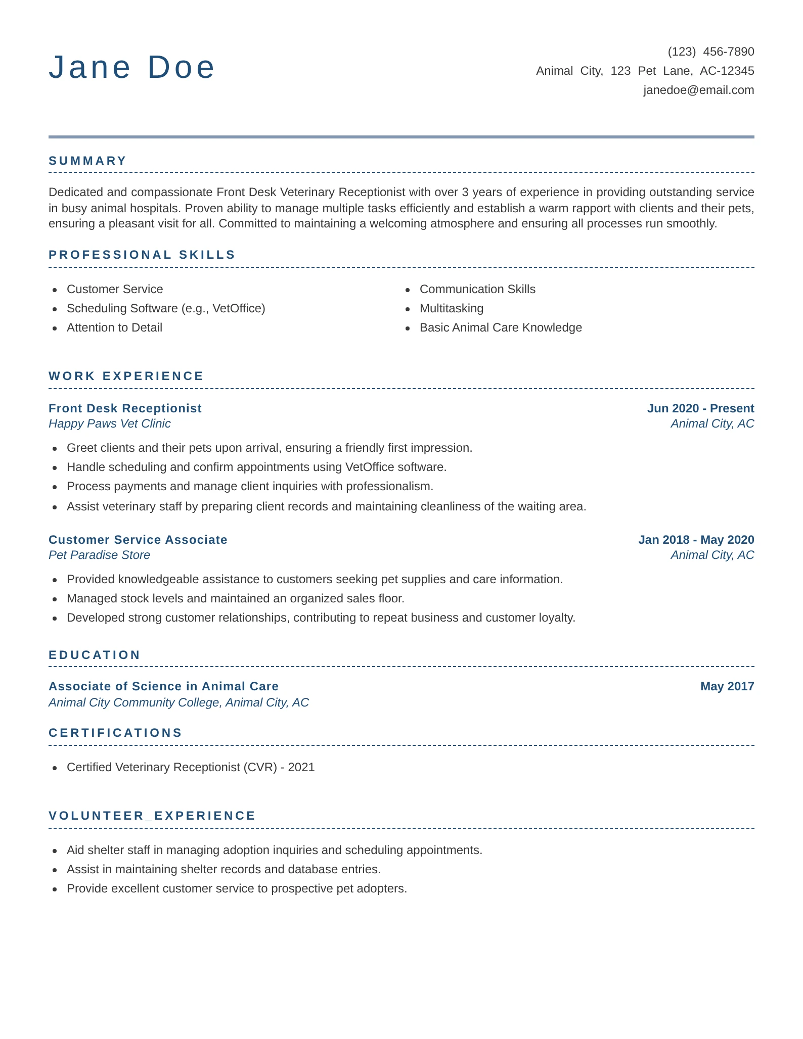 Crafting a strong veterinary receptionist resume is about more than listing tasks—it’s about presenting your skills, experience, and dedication in a way that resonates with hiring managers. By carefully selecting the right format, highlighting your unique abilities, and demonstrating your commitment to both administrative excellence and animal care, you position yourself as a reliable and professional candidate. Remember, every detail—from your professional summary to your skills and accomplishments—can make a difference. With thoughtful preparation and attention to detail, you can create a resume that not only stands out but also opens the door to a rewarding career in a veterinary clinic.