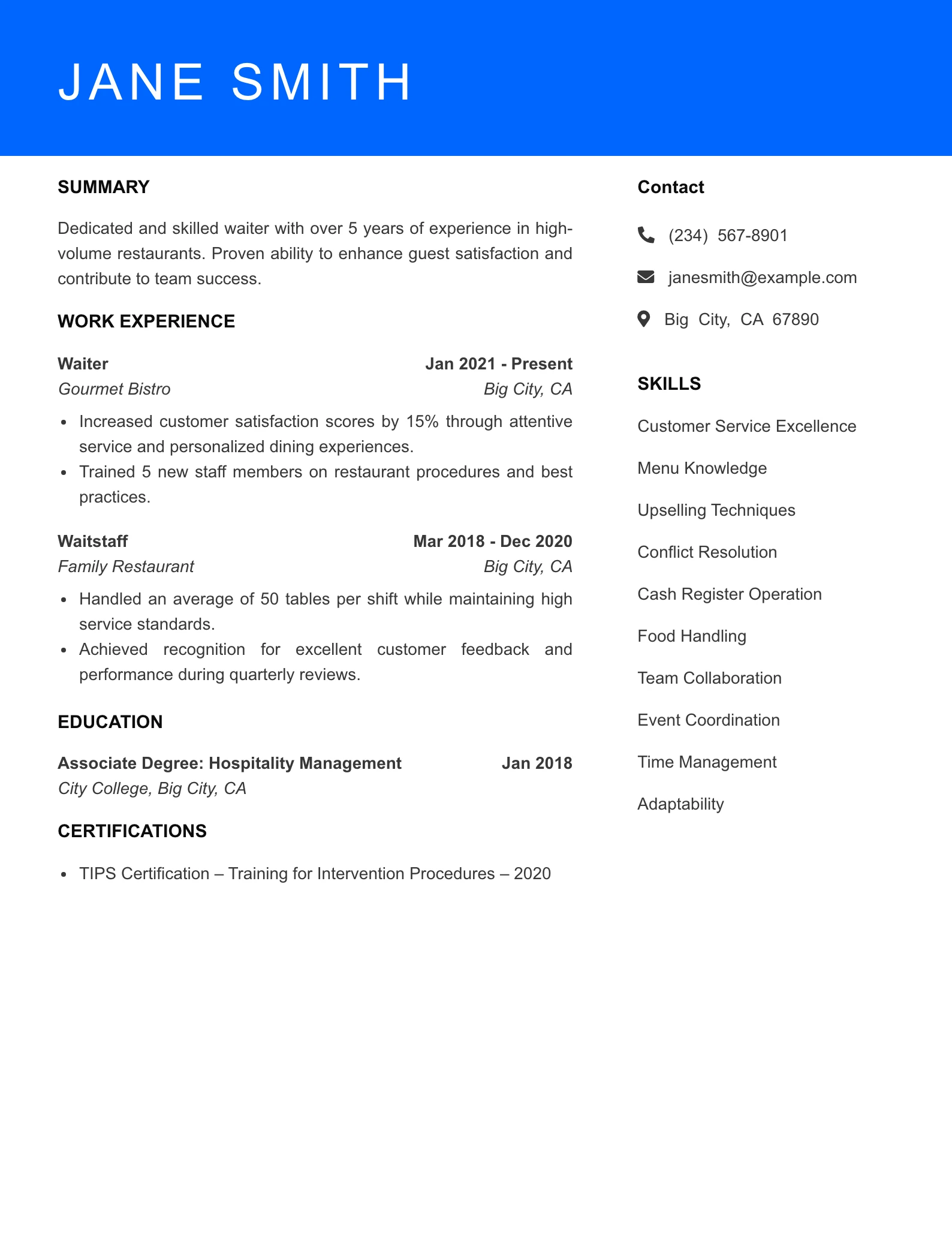 In the bustling world of hospitality, having a standout Waiter resume is essential for capturing the attention of hiring managers. Our collection of resume examples for Waiter roles in 2025 is designed to guide you through crafting a compelling resume that showcases your unique skills and experiences. Whether you’re a seasoned professional or just starting out, these examples will empower you to present your qualifications effectively and increase your chances of landing that coveted position.